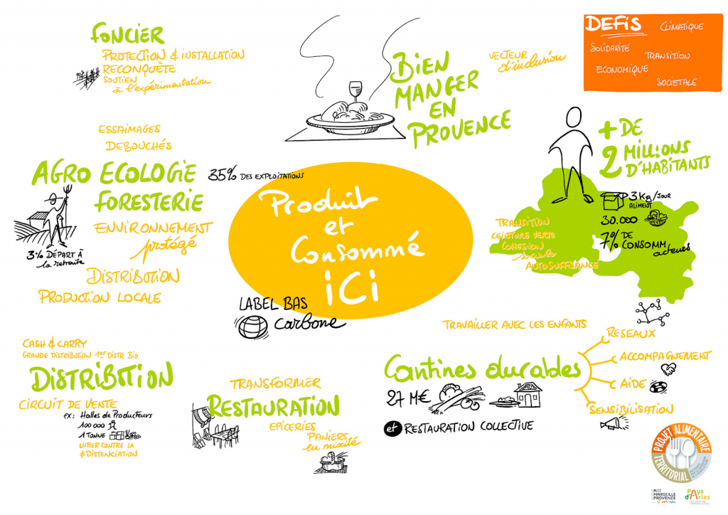 La métropole Aix-Marseille-Provence (AMP) porte un Projet Alimentaire Territorial (PAT) depuis 2018, labellisé niveau 2 en 2021, le plus vaste de France en termes de superficie et de population. Sa feuille de route s’articule autour de trois axes : maintenir la capacité agricole et productive du territoire, développer les débouchés locaux pour une alimentation durable et juste, et animer le territoire pour accélérer la transition.